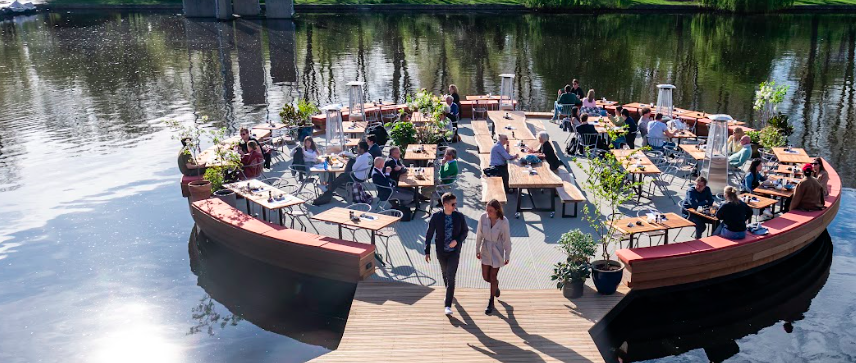 Next year, Strandzuid will celebrate its twentieth anniversary. This popular Amsterdam spot has been kicking off the spring and summer seasons with fantastic parties for years. The beautiful terrace, partly on a round deck in the water, focuses on lunch and dinner but also hosts events to create awareness. They transform into Strandoranje during the European Football Championship, hold renowned Bierborrels, or organise parties with Frits. These events are enjoyable and serve to attract new visitors and maintain buzz, ultimately boosting terrace turnover with a sophisticated à la carte offering. The experienced team, organising around 350 events annually, remains critical and meticulous, ensuring their strategies are well thought out and perfectly executed.
